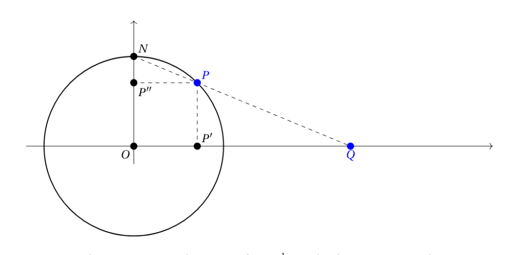 Appendix. The point $Q\in\mathbb{R}$ is the image of $P\in\mathbb{S}^1\setminus\{N\}$ by the 1D stereographic projection $T$ with respect of the north pole $N$. The image of $N$ is $\infty$.